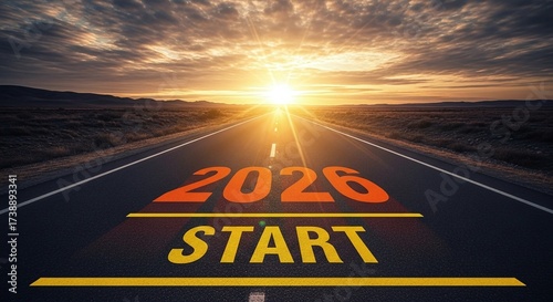 Asphalt road with '2026 START' text painted, stretching towards a bright sunrise over a desert landscape with dramatic clouds.