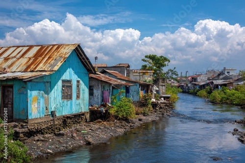 Indonesia Poverty: North River Shantytown with Tin Sheet Houses under Blue Sky