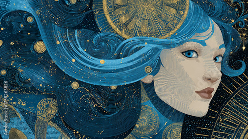 Portrait of a cosmic woman in Art Nouveau style, featuring intricate blue and gold celestial elements, elegant flowing lines, and a mystical, ethereal atmosphere