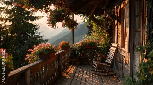 Cozy mountain cabin porch with vibrant flowers at golden hour, peaceful rural escape.