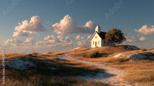Scenic landscape featu a small white church with a steeple on a grassy hill surrounded by sparse trees under a partly cloudy sky du daytime