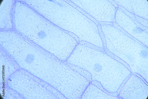 Zdjęcie mikroskopowe. Komórki roślinne. Komórki epidermalne cebuli. Powiększenie 400x.