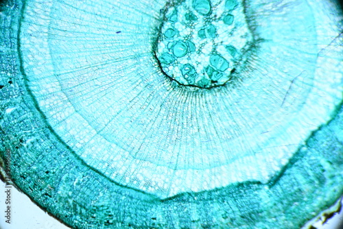 Zdjęcie mikroskopowe. Komórki roślinne. Łodyga drzewiastej rośliny dwuliściennej - przekrój poprzeczny. Powiększenie 40x.