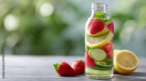 Infused water with lemon, strawberries, and cucumber in a clear glass bottle, clean health and wellness theme.