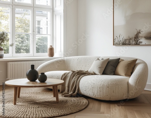 Jasne wnętrze z beżową kanapą o zaokrąglonych kształtach i okrągłym, drewnianym stolikiemm