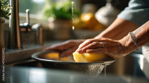 Midsection of senior woman scrubbing bowl with sponge in kitchen sink during household chores at home, under gentle natural light, highlighting focused activity and cozy setting, s