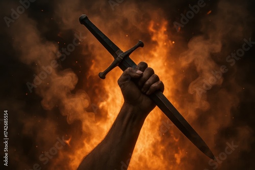 Latvia, Kandava, 2025-08-23, Latvijas kauss A Hand Holds the Sword of Victory Over Fire