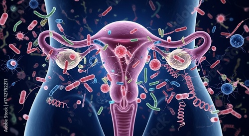 Illustration of a uterus surrounded by various types of bacteria and microorganisms in a dark setting