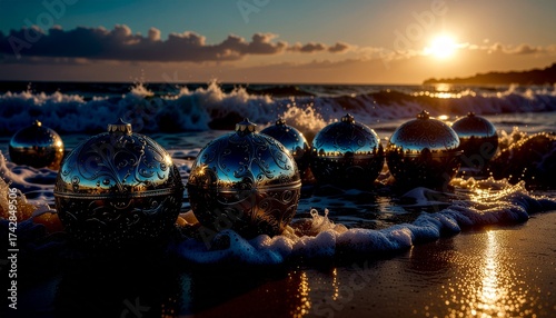 Ilustracja przedstawiająca bombki choinkowe leżące na skraju oceanu w promieniach zachodzącego słońca