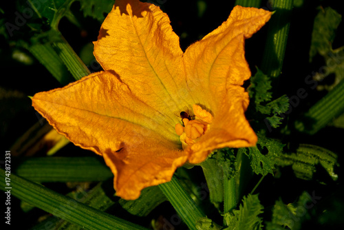 żólty kwiat cukinii z pszczołą, która go zapyla, pszczoła zapylajaca kwiat cukinii, Cucurbita pepo, bee pollinating a zucchini flower