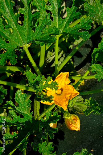 żólty kwiat cukinii z prszczołą, która go zapyla, pszczoła zapylajaca kwiat cukinii, Cucurbita pepo, bee pollinating a zucchini flower