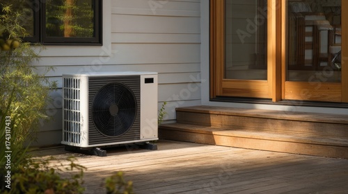 Outdoor gray heat pump unit on fresh wooden deck, modern house in pale siding tones, elegant architectural wood accents