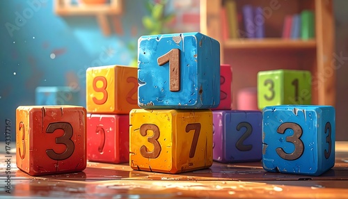 A stack of colorful wooden blocks, each displaying a unique number, sits on a sunlit wooden surface