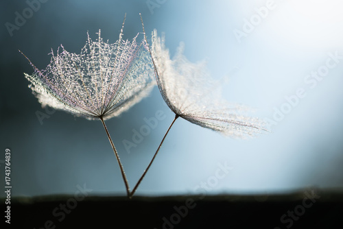 Makrofotografia główki nasion dmuchawca koziej brody z kroplami wody błyszczącymi w świetle słonecznym.
