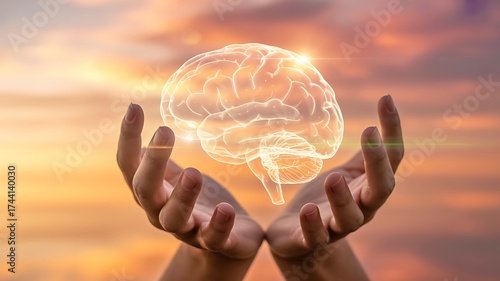 Brain held gently in human hands against an abstract orange background