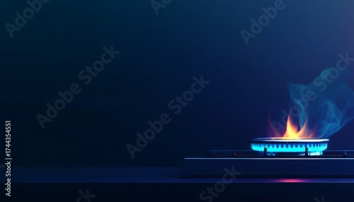 A single gas burner on a stovetop is lit, producing a blue flame and wisps of smoke, all set against a dark-blue backdrop.