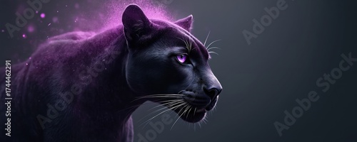 Black panther with glowing purple eyes, shimmering particles around head. Wild big cat stands against dark grey background. Majestic animal with mystic energy, fierce predator. Bold creature