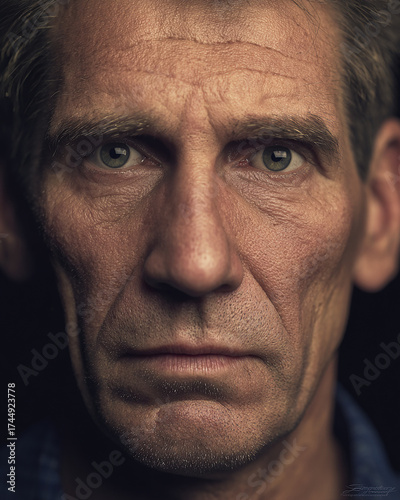 Portrait expressif d’un homme mûr au regard intense et à l’émotion contenue