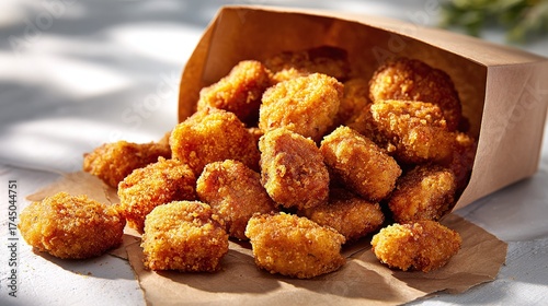 Crispy, golden fried chicken bites overflow from a kraft paper bag, tempting with their savory goodness. A delicious snack perfect for sharing!
