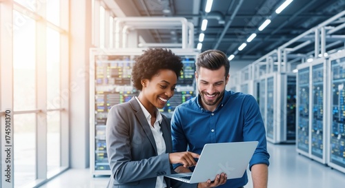 Diverse IT professionals collaborating in a modern data center. A man and woman work together on a laptop in a server room. Teamwork and technology concept