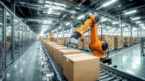Photorealistic robotic system sorting boxes on automated line in fulfillment center. High tech concept.