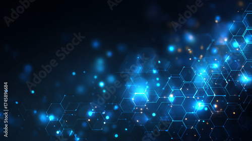 医療・科学技術イメージ:テクノロジーとネットワークを連想させるヘキサゴンの抽象的背景