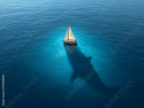 Sailboat casting giant shark shadow in ocean water