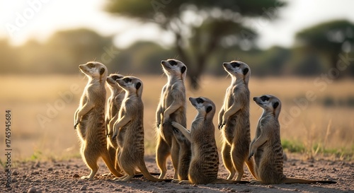 Curious Meerkats Standing Alert on Lookout in African Savannah at Sunset.