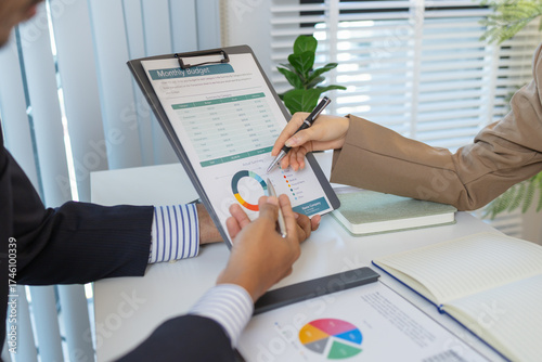 Business colleagues are engaged in a financial meeting, reviewing colorful charts and reports. They exchange ideas, make notes, and analyze strategies to achieve effective results.