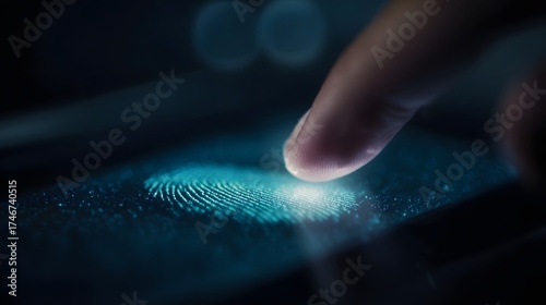 A finger is scanning a glowing fingerprint on a digital interface for security and authentication