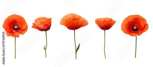 Five vibrant orange poppy flowers on thin stems isolated on transparent background