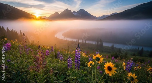 Mountain landscape sunrise flowers meadow river fog nature scenic beauty tranquility peaceful idyllic serene morning light golden hour