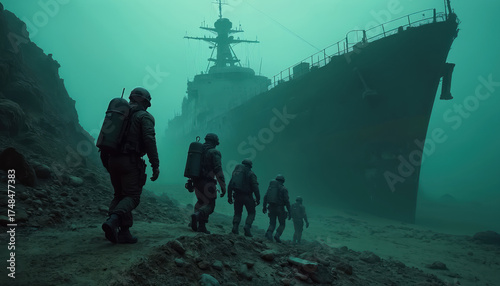 Soldiers walk toward sunken warship on seabed. Underwater exploration team navigates debris field near large vessel. Military group discovers submerged wreckage in deep dark ocean.
