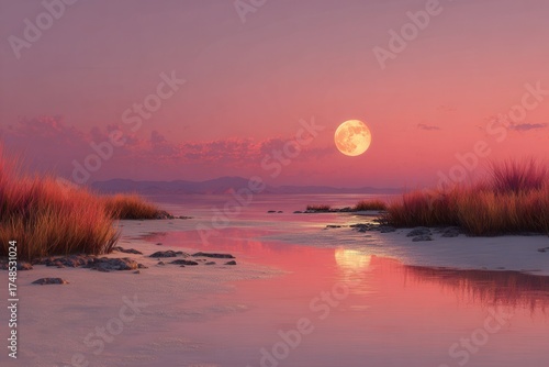 Pink sky and full Moon reflecting on still water during late evening in a landscape showing distant mountains and shoreline with tall grass