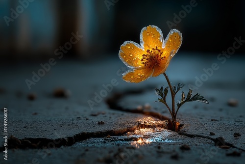 Yellow flower growing through cracked asphalt with raindrops on petals symbolizing hope strength and resilience in difficult conditions