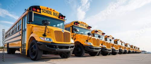 Yellow school buses lined up in row under clear blue sky, showcasing their bright color and design