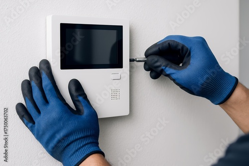 青い手袋をした作業員が壁に取り付けられたモニター機器を精密に調整するメンテナンス作業