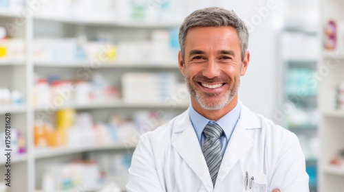 A pharmacist with gray hair and a friendly smile stands in a bright pharmacy. Shelves filled with various medications are visible behind him. He wears a white lab coat and appears professional.