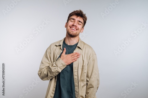 portrait of young man stands with his hand on his chest, wearing a warm smile that conveys gratitude and sincerity on white background