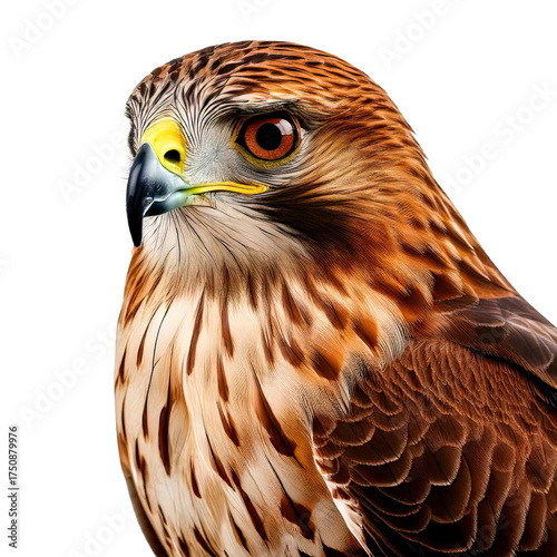 Close up of hawk head with sharp beak and intense orange eye, showing detailed brown and cream feathers, conveying powerful and focused expression