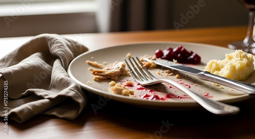 Empty or Leftover Plate After Thanksgiving or Holiday Meal with Scraps, Fork, and Knife