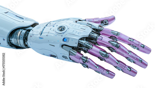 Sleek, white and pink robot hand extends with complex detailing