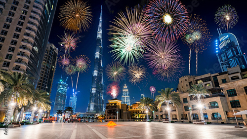 Spectacular night view of Dubai city with dazzling fireworks surrounding the Burj Khalifa, the tallest building in the world. The city lights, skyscrapers, and vibrant reflections capture the exciteme