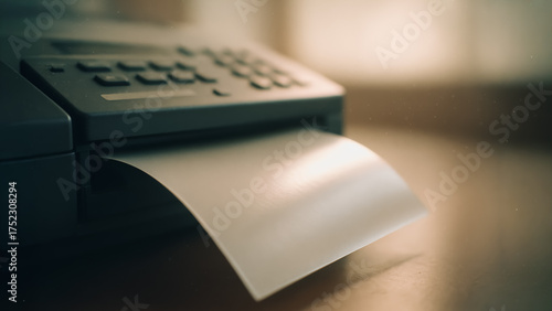 A vintage fax machine spews out a printed page, capturing a bygone era of office technology and communication.