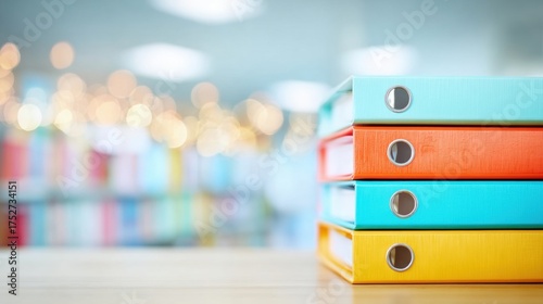 Brightly colored binders are organized in a neat stack on a wooden shelf, while a soft, warm atmosphere fills the bright room. The setting is inviting and well-lit