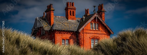 the old coastguard station in fleetwood with radar antennae with crass covered dunes leading to the beach on a summers day in bright sunlight with blue sky