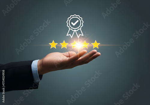 Hand holding glowing fivestar award badge with ribbon, success and achievement concept