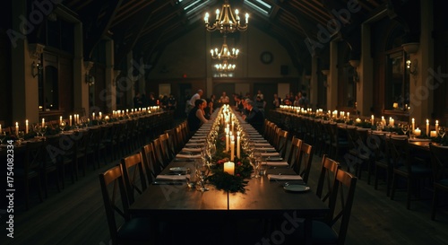 Elegant candlelit dinner party in grand rustic hall. Long table set for formal wedding reception or holiday banquet