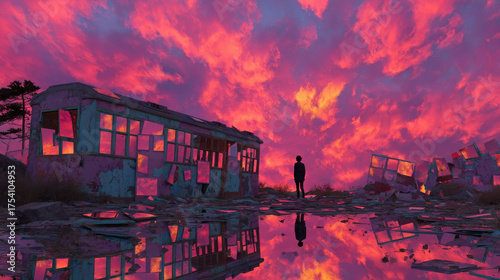 Silhouette of a figure standing amidst broken mirror fragments reflecting a vibrant sunset sky conveying anxiety and desolation