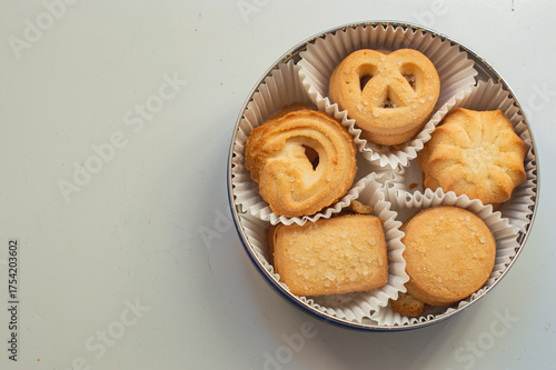 Box of cookies with shaped biscuits on white background with copy space